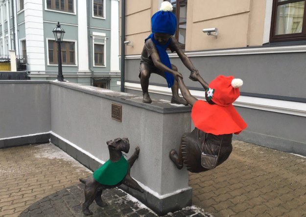 В Казани утеплили героев композиции «Доверие», которая находится на пересечении улиц Профсоюзная и Чернышевского. Мальчик, девочка и их собака получили зимние аксессуары: шапки, шарфы и прочее.