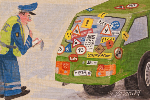 • Ездить без знака «начинающий водитель» тоже запрещается. Желтый квадрат с восклицательным знаком должен быть наклеен на заднее стекло автомобиля, если вождения не достиг 2 лет. Подробнее об этом мы писали здесь.