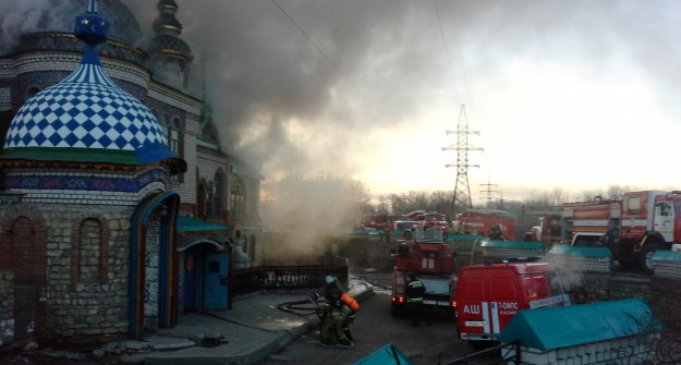 Сегодня рано утром в Казани загорелся Храм всех религий. На момент прибытия первых подразделений горела кровля и чердак. Пожарным пришлось потратить время на вскрытие дверных замков.
