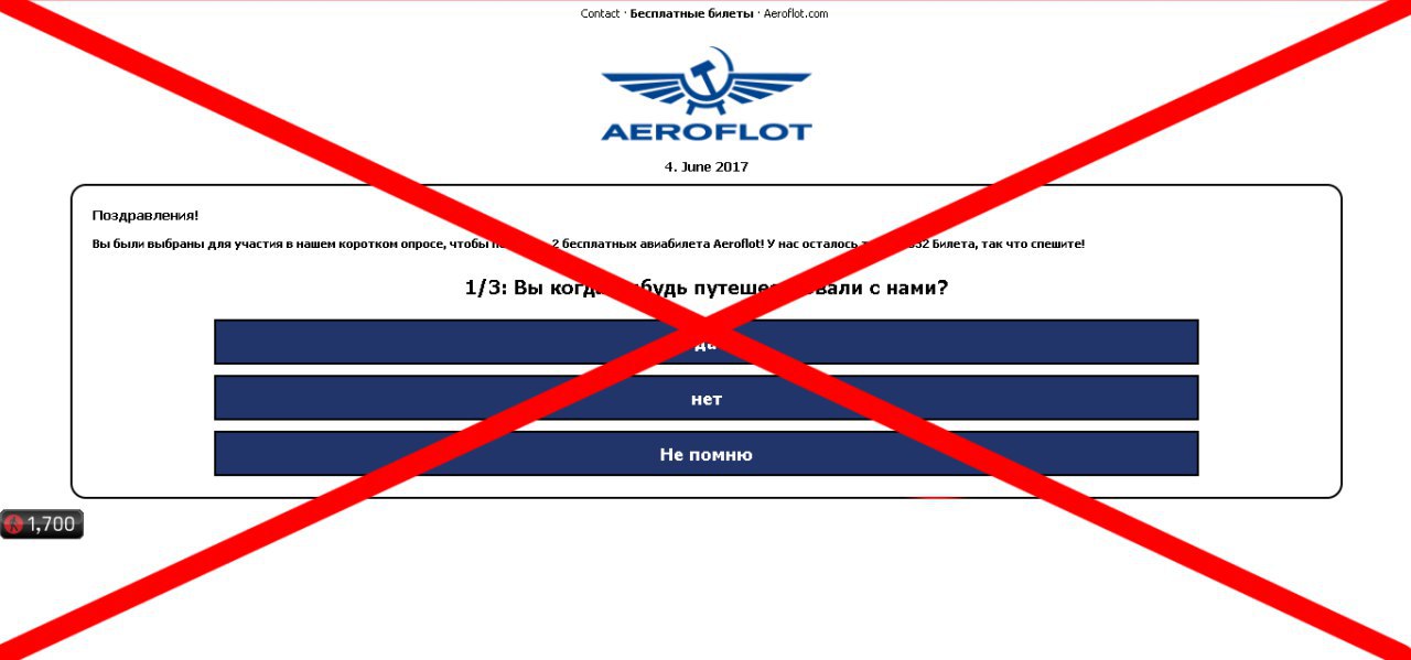 Пользователи соцсетей активно делятся ссылкой на сайт с опросом. Людей заманивают возможностью выиграть бесплатные авиабилеты. В конце опроса участнику нужно поделиться новостью о розыгрыше на своей странице в «Facebook». Название сайта, на который ведут ссылки, может начинаться по-разному: airgift.us, aeroflot-ticket.us, airgift-com.us. Результат перехода по ссылке может быть плачевным (вирус, хищение личной информации, денег и прочее).