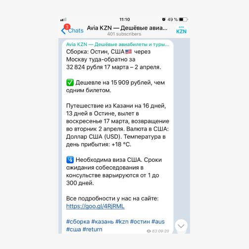 7. Avia KZN (@aviakzn) – канал специально для тех, кто давно хочет куда-то уехать, но не знает куда. Там можно найти проверенные авиабилеты и туры и не переживать ни о чем. Остается только летать.