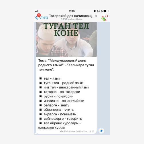 1. Вместо занятия с репетитором по цене тележки продуктов можно подписаться на бесплатный telegram-канал «Татарский для начинающих» (@tatyaz). Доски позора там нет, поэтому присоединяются даже те, у кого с татарским ну очень натянутые отношения. В канале есть разные уроки. Например, слова на тему «Кунакханәдә» (в гостинице).