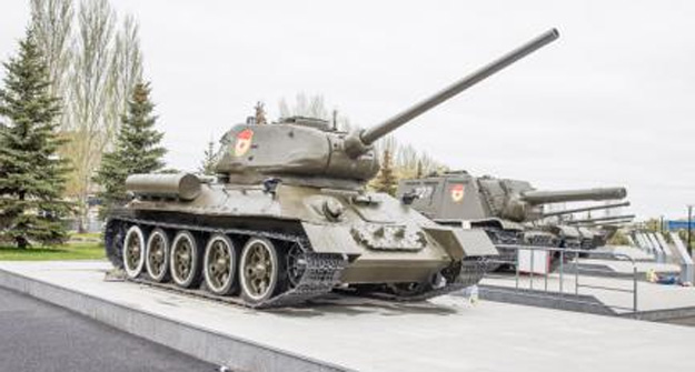 В парке установлен танк Т-34. Машина участвовала в боях в годы Великой Отечественной войны.