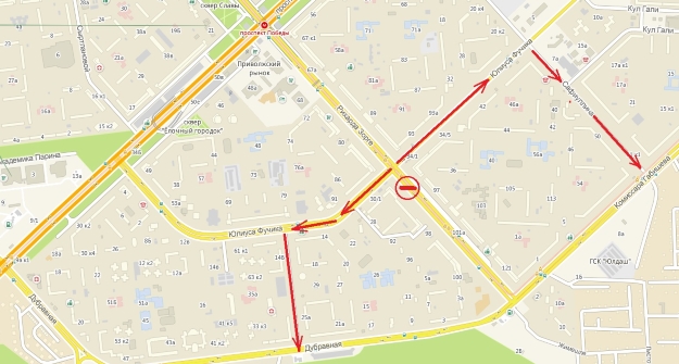 Для проезда от перекрестка Зорге-Фучика казанцы могут свернуть налево и проехать до Дубравной по второстепенной дороге, повернув между домами по улице Фучика 14, 14а, 14б и 16 или добраться до проспекта Победы и уже оттуда попасть на Дубравную. Проехав от перекрестка с «кирпичом» направо, водители смогут добраться до пересечения с Сафиуллина и беспрепятственно проехать к Дубравной, миновав участок улицы Габишева.