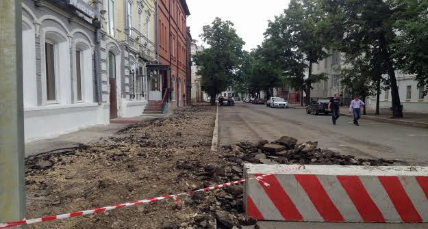 Свежий асфальт на перекрытой части дороги уже лежит, частично вскрыт тротуар. Пешеходам тоже приходится туго. Невозможно идти по улице Жуковского, по той стороне, где расположилось кафе «Лакомка». Состоянию дорожного покрытия удивились бы даже герои недавнего боевика «Разлом Сан-Андреас».