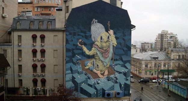 Казанский уличный художник Рустам Qbic расписал стену одного из домов в Киеве. Свою граффити-работу он назвал «Лабиринт».