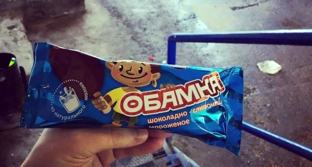 Напомним, на упаковке «Обамки» изображен улыбающийся смуглый мальчик с серьгой в ухе. Он держит в руках эскимо и ненавязчиво предлагает попробовать мороженое.