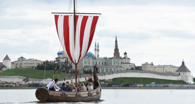В Казани открылся сезон водных экскурсий по Казанке. Казанцы могут поплавать на деревянной ладье с фигурой Зиланта на носу.