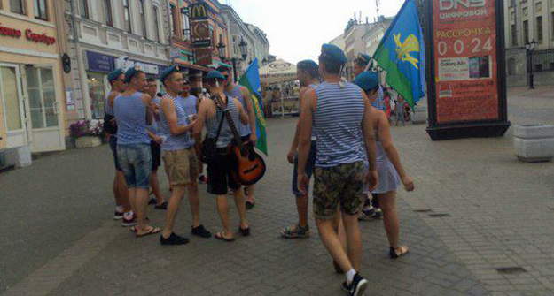 В Казани День ВДВ уже набрал обороты. Пользователи социальных сетей рассказывают, как десантник, схватив флаг ВДВ, доплыл до самого высокого фонтана города на озере Кабан и взобрался на него. Он оказался единственным, кто решился на этот поступок. Остальные десантники остались купаться в фонтанах перед театром Камала.