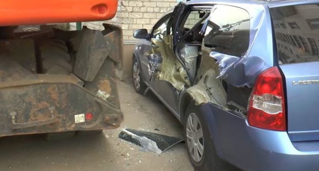 Спецтехника занималась земельными работами и случайно задела машину. Теперь пассажирская дверь авто стала выполнять декоративную функцию. Заглянуть в салон «Chevrolet» может любой желающий.