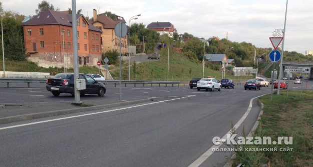 В Казани на проспекте Универсиады, на развязке у пересечения с улицей Назарбаева, нет пешеходного перехода. Тротуар, который есть на самой развязке со стороны улицы Шаляпина, заканчивается в конце эстакады. Однако дорога никуда не приводит пешехода.