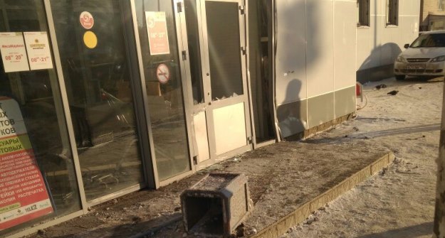В Казани автомобилист протаранил «Пятерочку» на улице Достоевского. Водитель врезался в дверь, разбил витрину и снес урну.