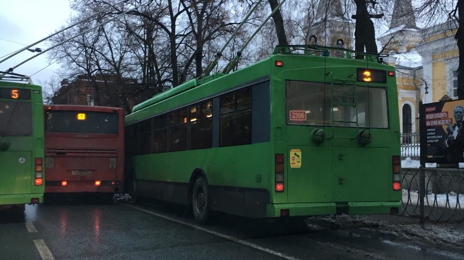 Сегодня утром на улице Горького произошло сразу 2 ДТП. В одном из них столкнулись пассажирский автобус №63 и троллейбус №3, сообщают е-Kazan.ru очевидцы.