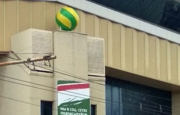 Баскетбольные мячи на колоннах «Баскет-холла» заменили на футбольные. Этим летом главным будет футбол, а не баскетбол. Все правильно.