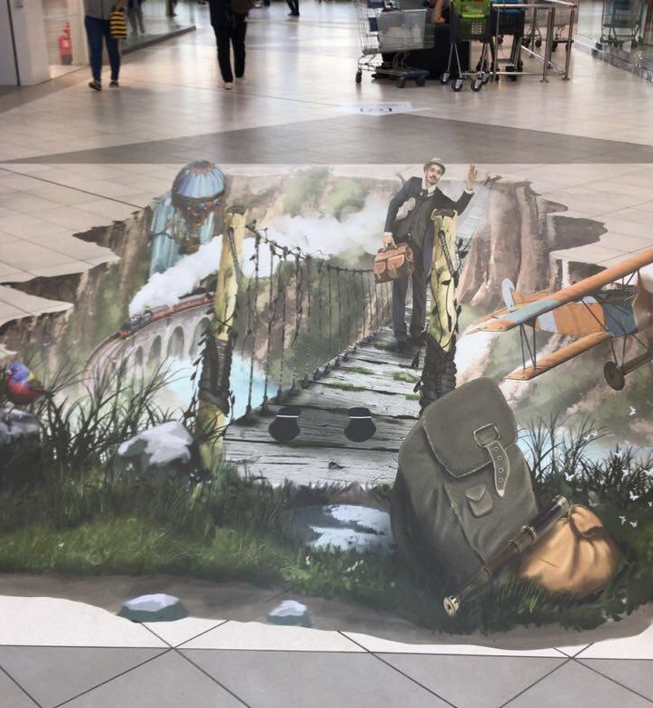 В коридорах «Меги» появились джунгли и большой обрыв. На полу, конечно. Это 3D-изображения, которые заставляют родителей фотографировать детей на их фоне. Еще можно встретить Маленького принца, Розу и Лиса, сидящих на планете, и другие изображения. Выглядит натурально – хочется сесть рядом с персонажами.