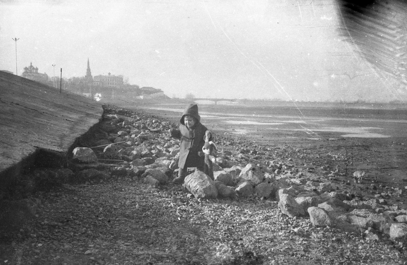 7. 1980-1990 годы. Судя по фото, уровень воды в Казанке в эти годы был катастрофическим. Ребенок даже осмелился спуститься с дамбы. Вдалеке виднеются Казанский Кремль и другая дамба – Ленинская.