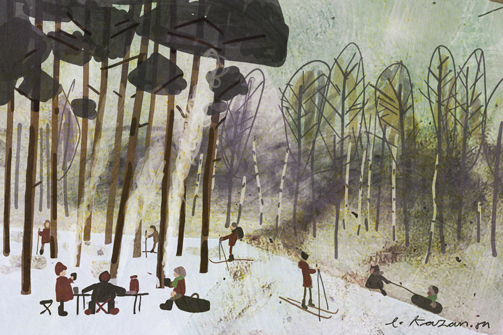 Внутри лес напоминает Свияжские холмы. Есть все: экстремальные спуски с гор, гонки на тюбингах и санях. Правда, в выходные людей так много, что случаются тюбинговые заторы.