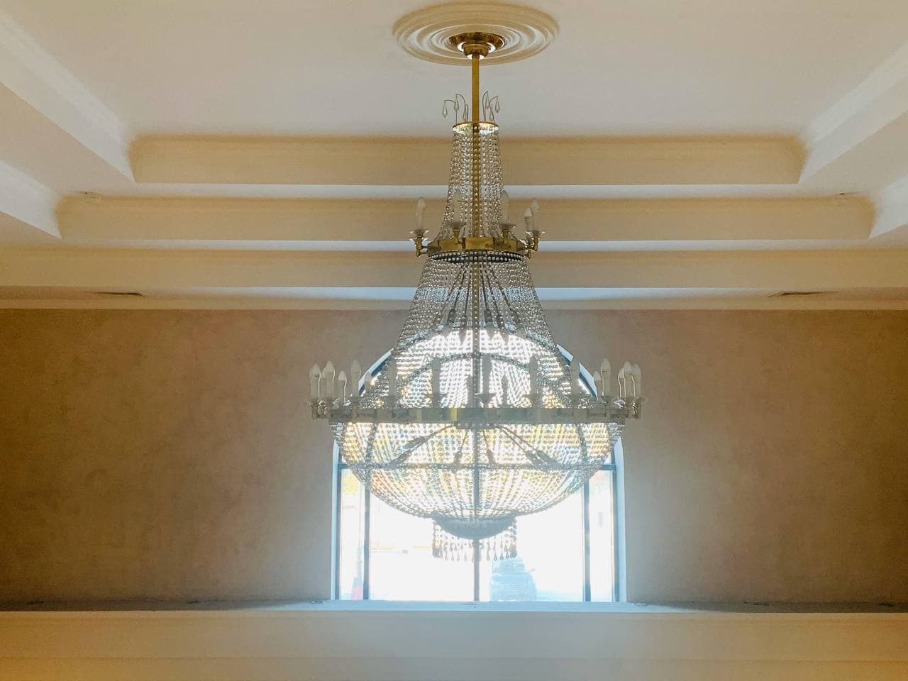 Только люстра способна оправдать ожидания: она хотя бы немного соответствует наружной помпезности.