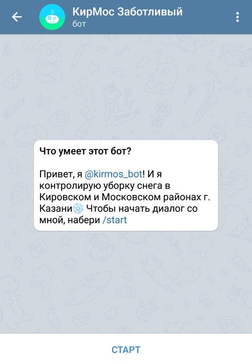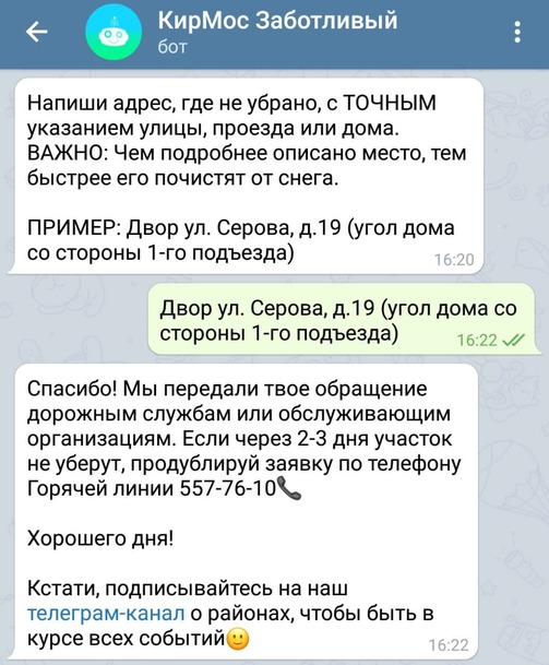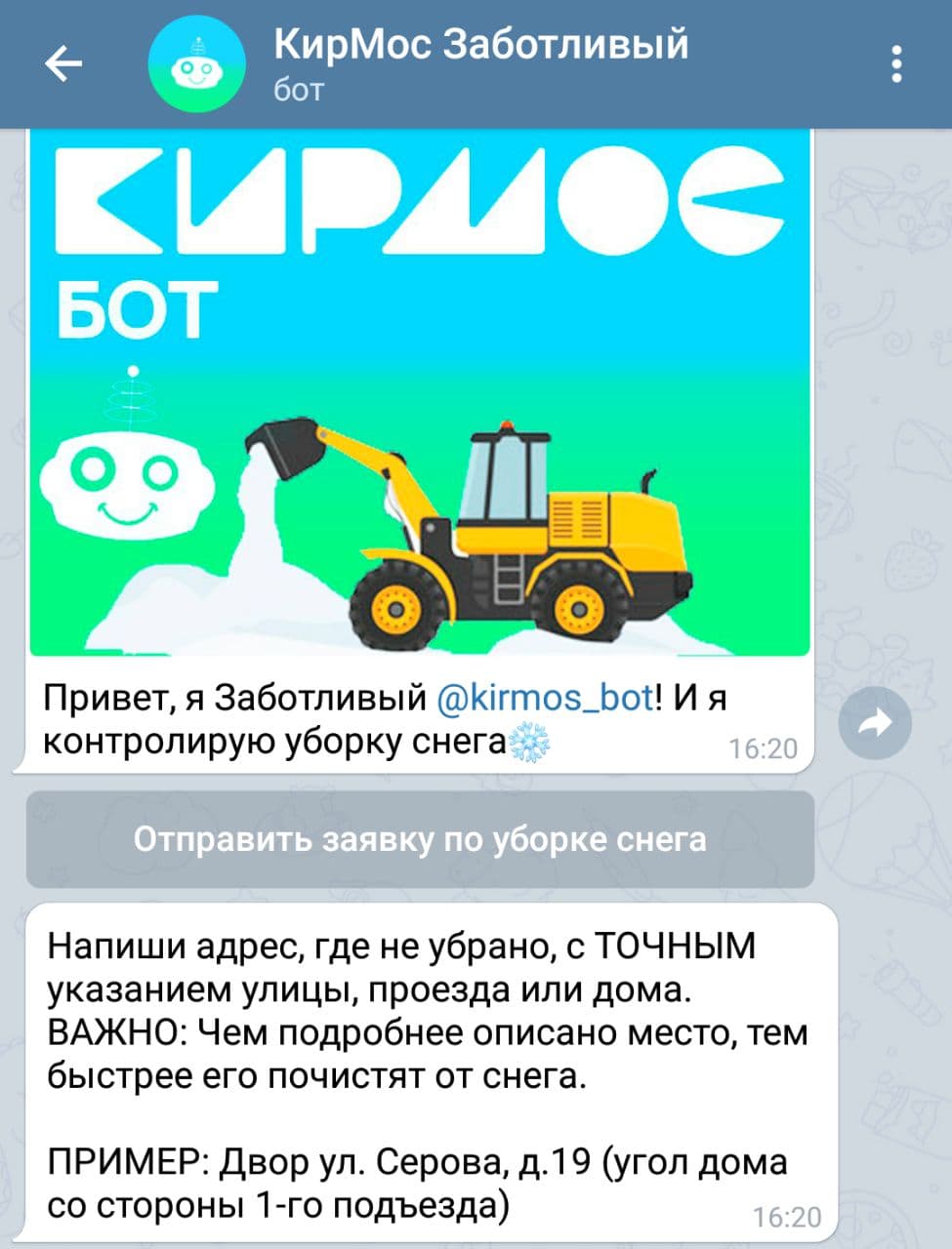 Администрация Кировского и Московского районов запустила сервис, который точно понравится интровертам. Можно заказать уборку снега во дворе через телеграм-бот.