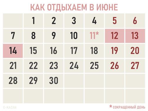 В июне тоже будет дополнительный выходной с сокращенным днем. Отмечаем день России — с 12 по 14 июня.