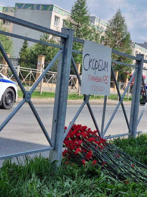 14:17. Рядом с гимназией появился стихийный мемориал. Люди несут цветы.