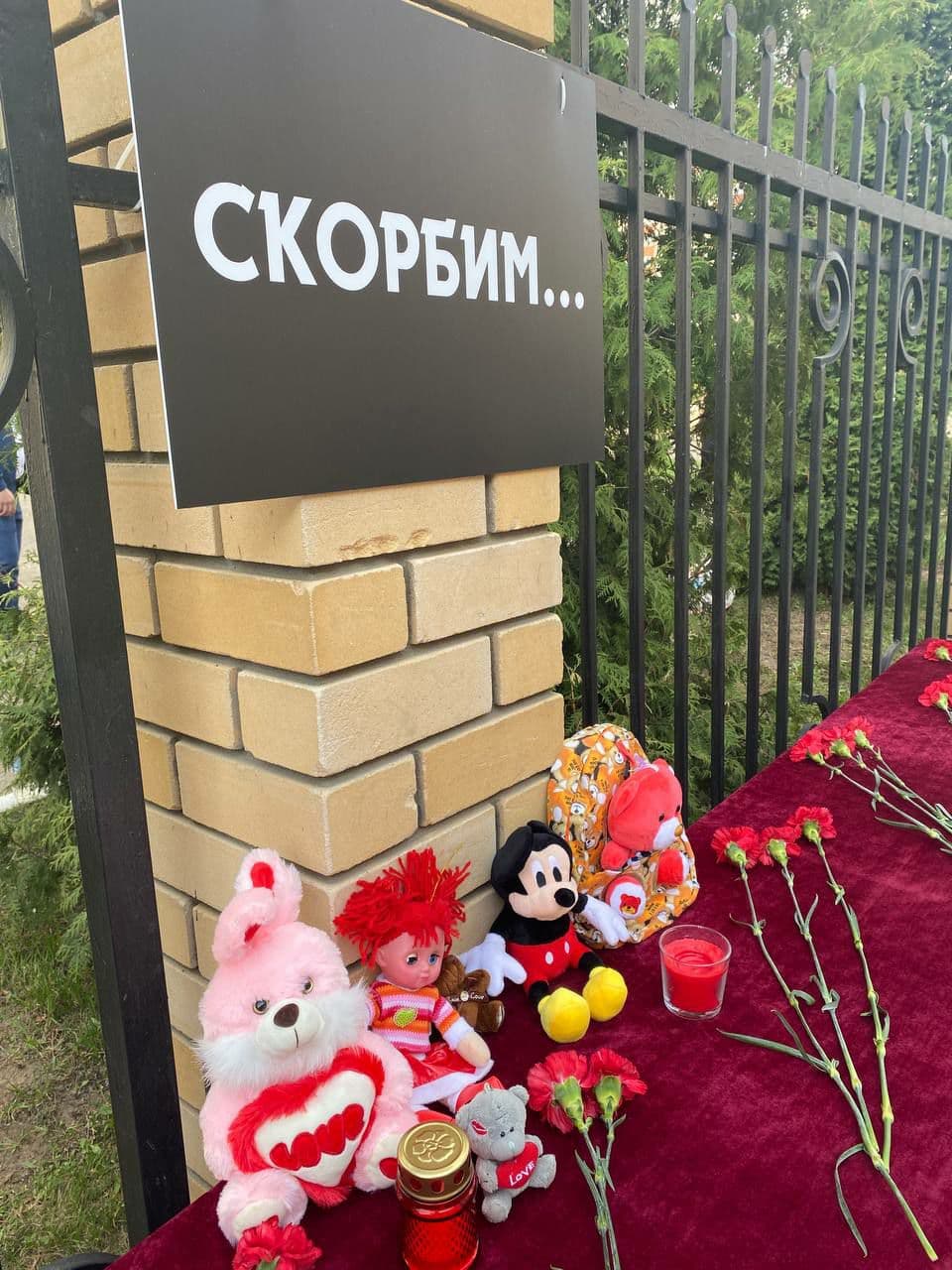 У гимназии №175 появился стихийный мемориал. Люди несут игрушки, цветы и ставят свечи.