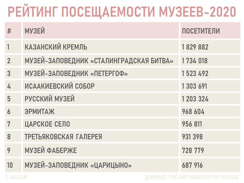 Русский музей, Эрмитаж, Третьяковка — что объединяет эти великие музеи? Все они уступают Казанскому кремлю в популярности. Так сказали не мы, а всепобеждающая статистика. Ее опубликовало издание The Art Newspaper Russia.