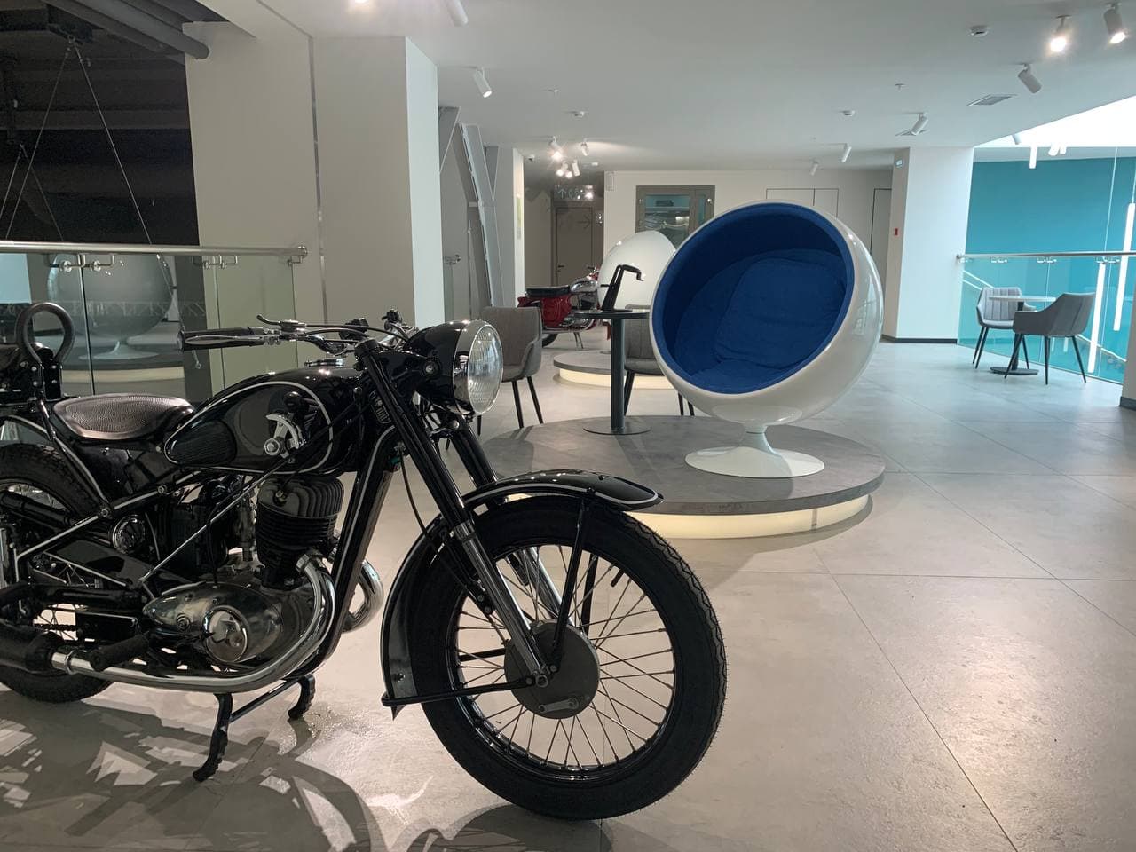 Сложно разобраться, где заканчивается одна зона выставки и начинается другая. Но если увидите стихийно припаркованную группу мотоциклов, знайте: это мотозона. Дальше — в лифт и на второй этаж с большим кафе-коворкингом.