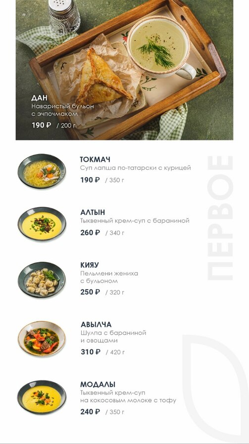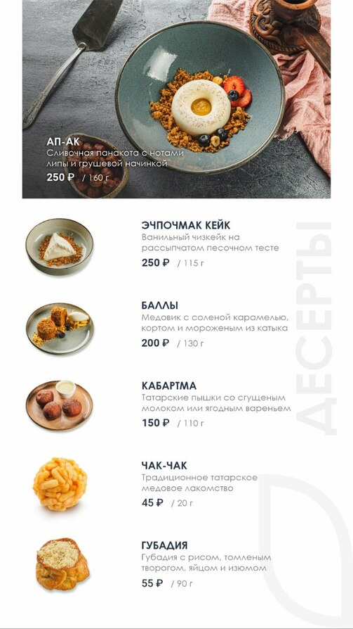 Здесь классическая лапша, эчпочмак и элеш как-то уживаются с бататом, поке, панакатой и другими варягами. Пока без гастрономических конфликтов. Даже рождаются союзы: так на свет появились сладкий эчпочмак кейк и татарская панакота ап-ак.
