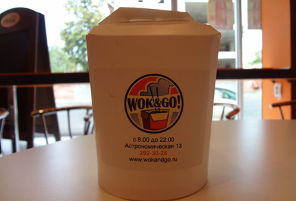В Казани, на пересечении улиц Астрономической и Профсоюзной, появилось заведение «Wok & Go», где готовят китайские лапшу и рис на сковородках «вок». Наконец-то казанцы дождались этой счастливый минуты, когда можно получать еду на вынос в картонных коробках.