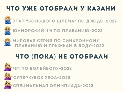 У Казани продолжают отбирать престижные международные соревнования. Показываем, чего мы уже лишились, а чего — еще нет.