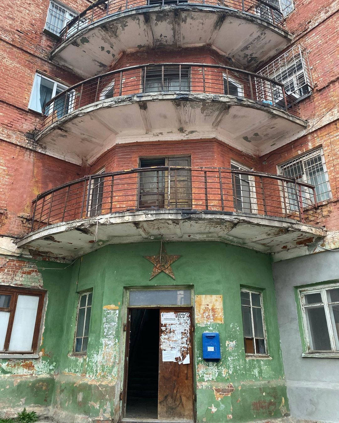 Некоторые его так и называют — дом со звездой. Она висит прямо над входом. Раньше это было общежитие для работников завода обозных деталей, а теперь здесь живут люди и гуляют любопытные.