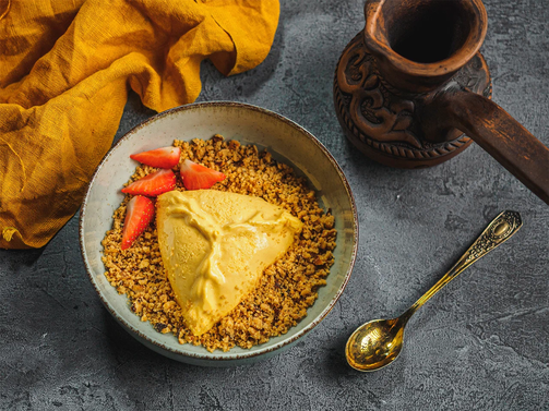 В татарском кафе встряхнули классический рецепт чизкейка и получили сладкий эчпочмак. Это облепиховый десерт на рассыпчатом песочном тесте, украшенный ягодами. Внутри — никаких сюрпризов.