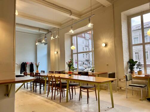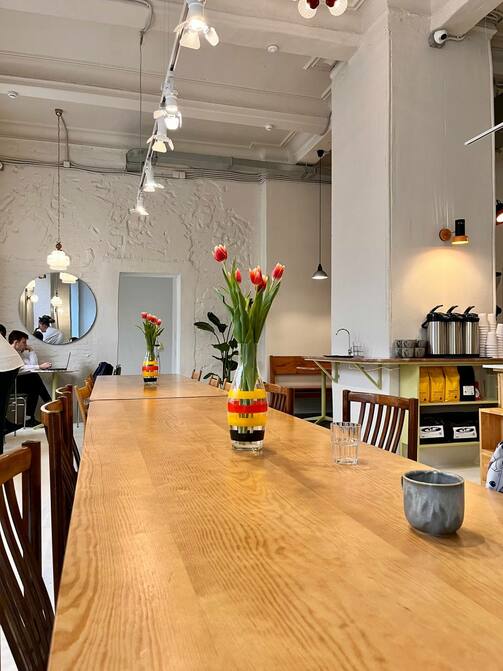 Скоро заработает собственный пекарский цех, а пока творожные кольца и булочки привозят из «Пташки». Здесь намеренно отказались от кухни, чтобы сосредоточиться на кофе. Каждый день заваривают минимум три сорта фильтра, но есть и вся классика: капучино и так далее.