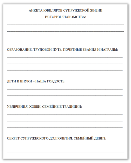 Но есть два условия. Брак должен быть зарегистрирован в Казани и сами супруги должны быть прописаны здесь. Помимо документов, они должны приложить к заявлению анкету. В ней нужно рассказать историю знакомства, поделиться секретом супружеского долголетия и даже указать семейный девиз.