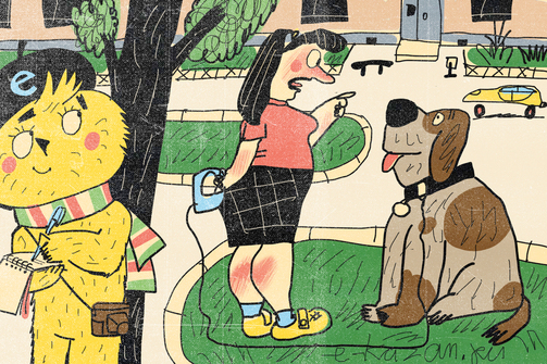 7. Вечер. На клумбе возле подъезда крутится маленький пес. Рядом — его хозяйка, которая в приказном тоне заявляет: