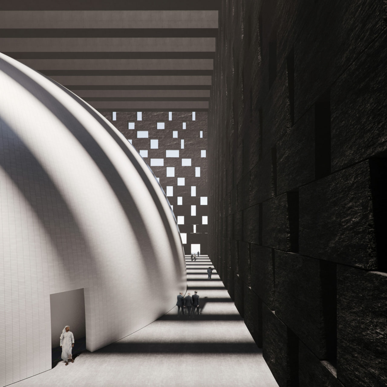 «Облик здания отражает сочетание светского и религиозного, открытого и в то же время сакрального. Решение фасадов развивает эту идею: каменные блоки сдвинуты таким образом, чтобы в кладке образовались просветы. Так купол зала можно увидеть с большого расстояния и с идущих по реке судов.