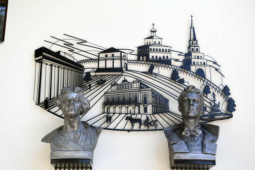 Бронзовый дуэт украсили кованым панно с видами старой Казани.
