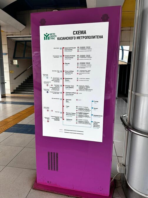 Первая линия метро отмечена красным, а строящаяся вторая — синим пунктиром. Тут есть станции «100-летие ТАССР», «Академическая», «Зилант» и «Тулпар». Также указаны маршруты трамваев, троллейбусов и автобусов, на которые можно пересесть.