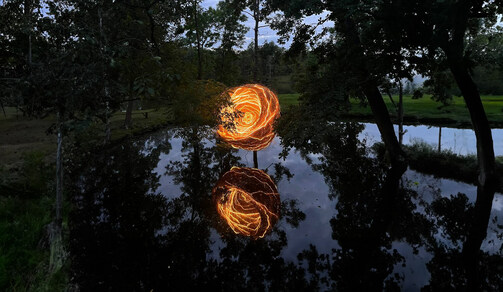 Природоподобная инсталляция-гнездо, сплетенное из ивы и диодных лент. Оно воспроизводит пение птиц, а его свет реагирует на звуки.