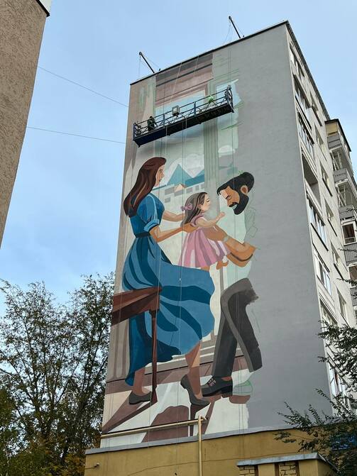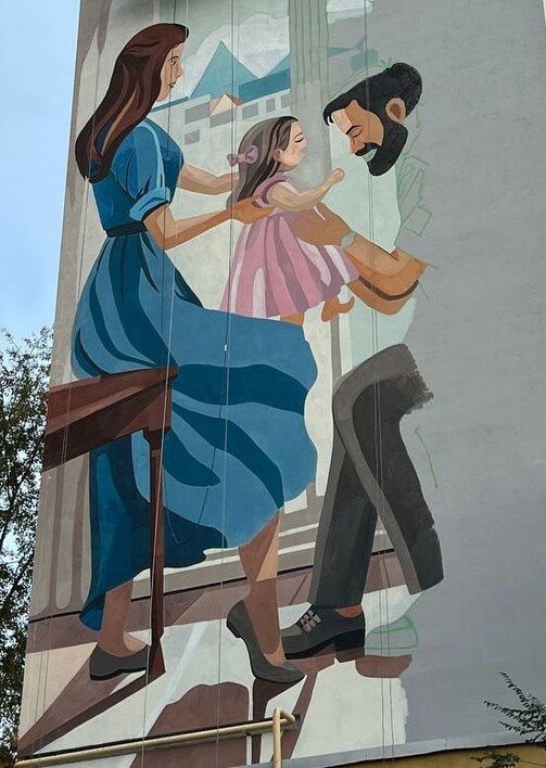 Казань, конечно, не Екатеринбург и не Нижний Новгород, но здесь тоже кое-что умеют делать с голыми стенами. На углу Зорге – Братьев Касимовых рисуют добрый семейный мурал.