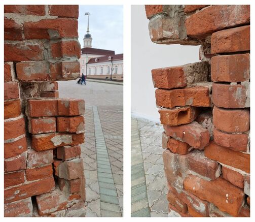 Издалека не видно, но если подойти поближе, то можно увидеть трещины и разрушение кирпичной кладки в основании. С прошлого года защитники старины просят оградить опасный участок и заодно защитить башню Сююмбике от туристов. Гости города думают, что ее нужно обязательно потрогать, а еще положить в щели монетки. И вот результат: