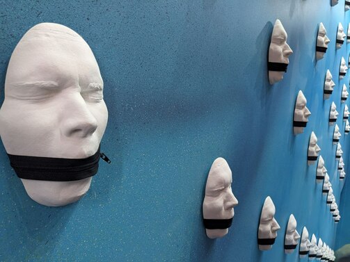 5. На лестнице ждут десятки лиц, у которых рот на замке. Еще встречаются портреты Микки Мауса, покрытые паутиной старости. Это отсылка: в одной из последних локаций, на цокольном этаже, постаревшая легенда Диснейленда смотрит телевизор — на молодого и бодрого себя.