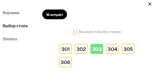 4. Перейти к оплате и выбрать номер столика. Здесь же указать, когда вас ждать: перед спектаклем или во время антракта.