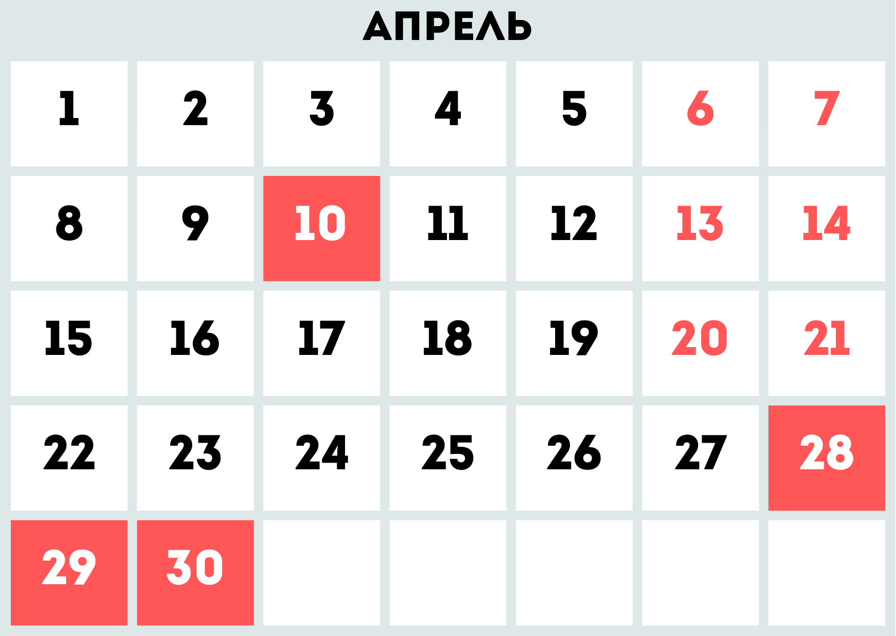 Эта рабочая неделя шестидневная. Почему? Правительство решило поменять местами субботу (27 апреля) и понедельник (29 апреля), чтобы подарить всем четырехдневные выходные — с 28 апреля по 1 мая.