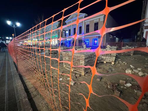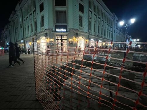 Большая часть улицы Баумана перерыта, «вскрытые» участки ограждены строительной сеткой. Гуляющим оставили проходы по краям.