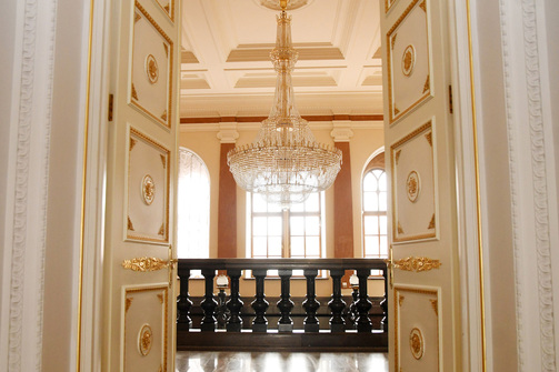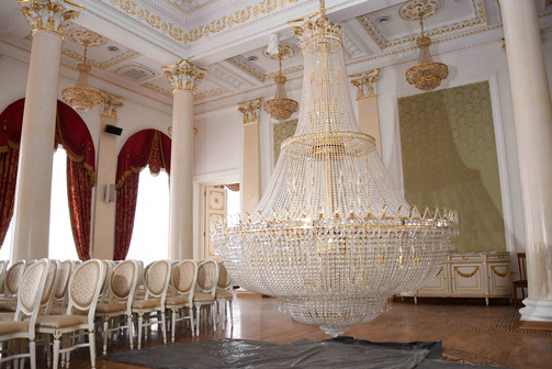 Эти люстры привезли из Австрии в 2005 году, они из хрусталя Swarovski. Центральная весит около 450 кг, остальные — 300 кг. Огромные светильники моют раз в год, одновременно меняют лампочки и чистят несколько тысяч хрусталиков. Обычно это происходит летом.