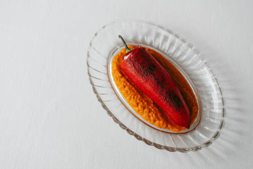 1. Фаршированный перец с сюзьмой и икрой из кабачка — приятная холодная закуска, где нежную кислую сюзьму заключили в перец. Вся гастроконструкция красиво уложена на кабачковую икру, которую будто бы достали из бабушкиного погреба.