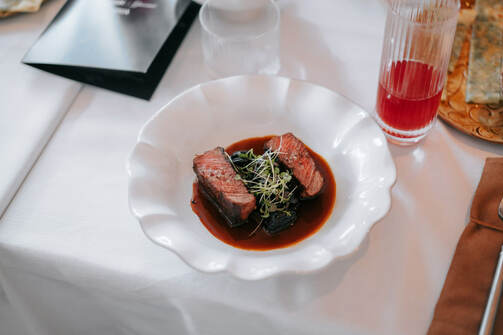 4. Стейк из фермерской говядины с копченым виноградом и соусом из кваса — после гламурного свекольно-смородинового комбо подают брутальный стейк, напитанный ливанским маринадом. Местных ноток ему придает горьковатый соус из кваса и копченый виноград, напоминающий чернослив.