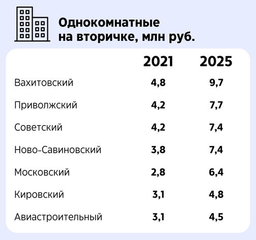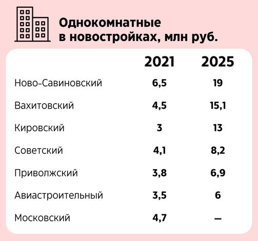 Цены на жилье в Казани продолжают стремиться ввысь. Особенно больно могут сделать Кировский со средней стоимостью однушки в 13 млн рублей, Вахитовский c 15 млн и Ново-Савиновский с необъяснимыми 19 млн (хочется верить, что это какая-то статистическая ошибка). Эти же районы бьют рекорды по росту цен за последние четыре года. Те, кто успел приобрести здесь недвижимость в 2021-м, могут спать спокойно.